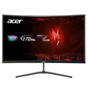 Introducing the Acer UM.CE3AA.V01 34″ Curved QHD Gaming Monitor, designed to immerse you in every gaming moment with stunning visuals and smooth performance. With its expansive 34-inch VA LCD panel and ultra-wide 21:9 aspect ratio, this monitor delivers a cinematic gaming experience like no other. The native resolution of 3440 x 1440 ensures crisp, detailed imagery, while HDR10 support enhances color and contrast for lifelike visuals. Experience buttery-smooth gameplay thanks to the impressive 165Hz refresh rate and lightning-fast 0.5ms response time, reducing motion blur and ensuring every frame is displayed with precision. FreeSync Premium technology synchronizes the monitor’s refresh rate with your graphics card, eliminating screen tearing and stuttering for fluid gameplay. Immerse yourself in the action with the 1000R curvature, which wraps around your field of view for enhanced depth perception and immersion. The glossy finish adds a touch of elegance to your gaming setup. Connectivity is made easy with two DisplayPort 1.4 ports, two HDMI 2.0 ports, and a 3.5mm audio output, allowing you to easily connect your favorite gaming devices. Plus, with built-in speakers, you can enjoy immersive sound without the need for external speakers. Adjust the monitor to your preferred viewing angle with tilt adjustments of up to 20 degrees, ensuring comfortable viewing for extended gaming sessions. The VESA mount compatibility gives you the flexibility to mount the monitor to your preferred setup. Step into a world of gaming excellence with the Acer UM.CE3AA.V01 34″ Curved QHD Gaming Monitor. Elevate your gaming experience today.